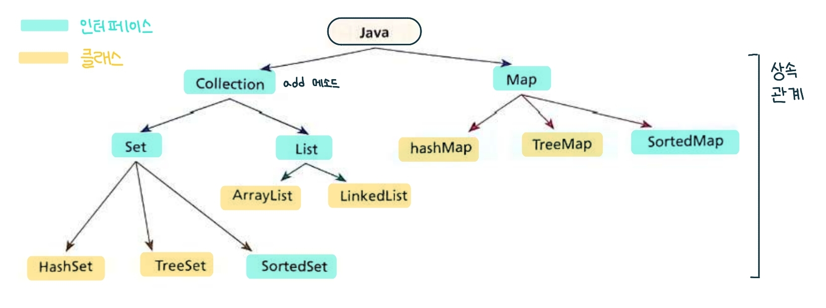 Collection 인터페이스를 상속받아, 구현한 모든 클래스가 메소드를 사용할 수 있음.