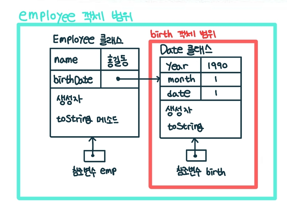 2. emp.birthDate.month = 12; // 참조변수 emp가 가리키는 객체의 참조변수 birthDate가 가리키는 객체의 month 값 변경