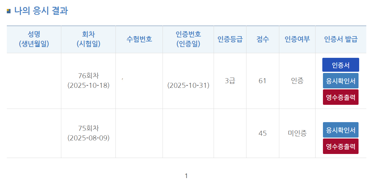 결국 76회 시험에서 61점 받고 3급으로 합격했다.